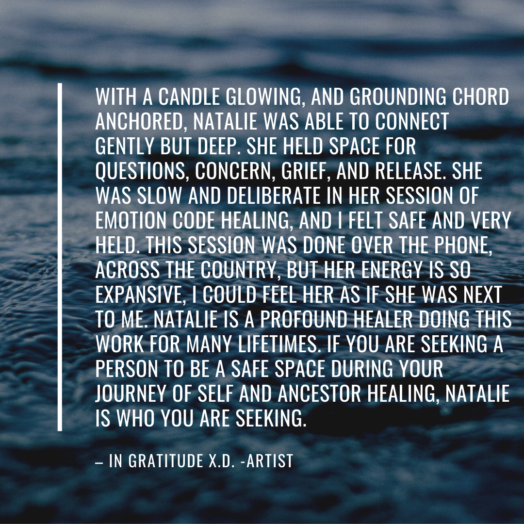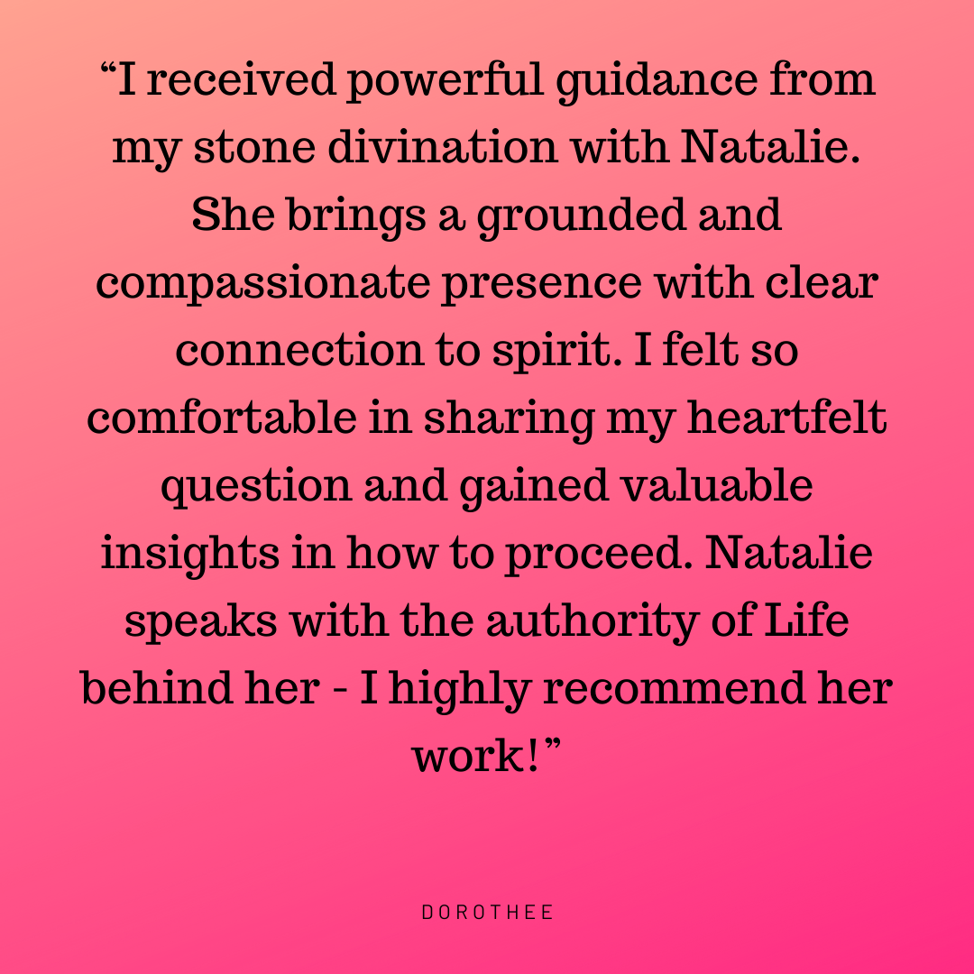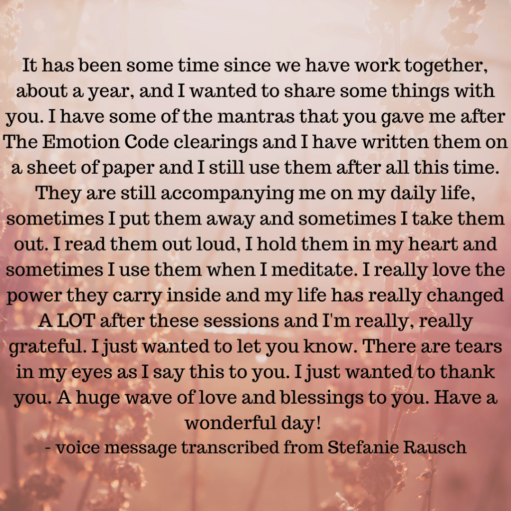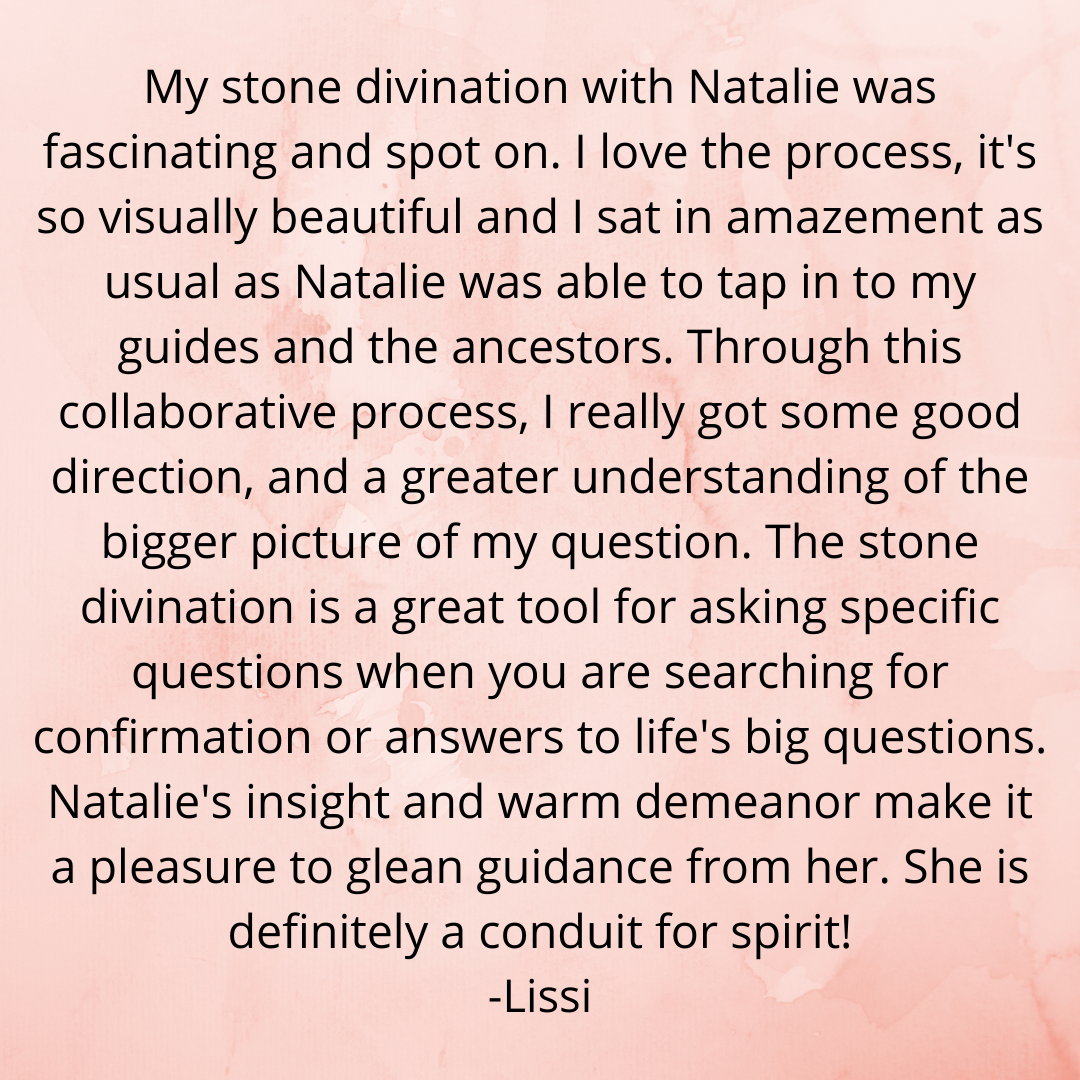 Client Testimonials Transformational 1-on-1 Sessions: The Emotion Code®: The Emotion Code® & Negative Beliefs Clearings: Group Programs: Ancestral Support Ritual: Stone Divinations: