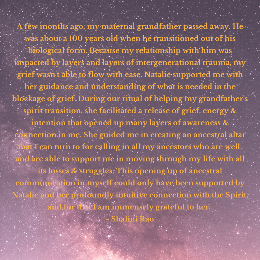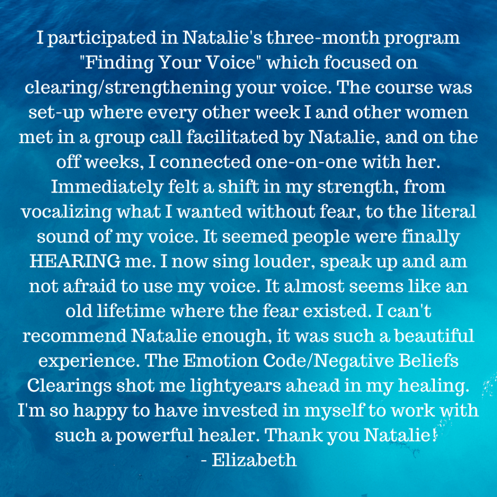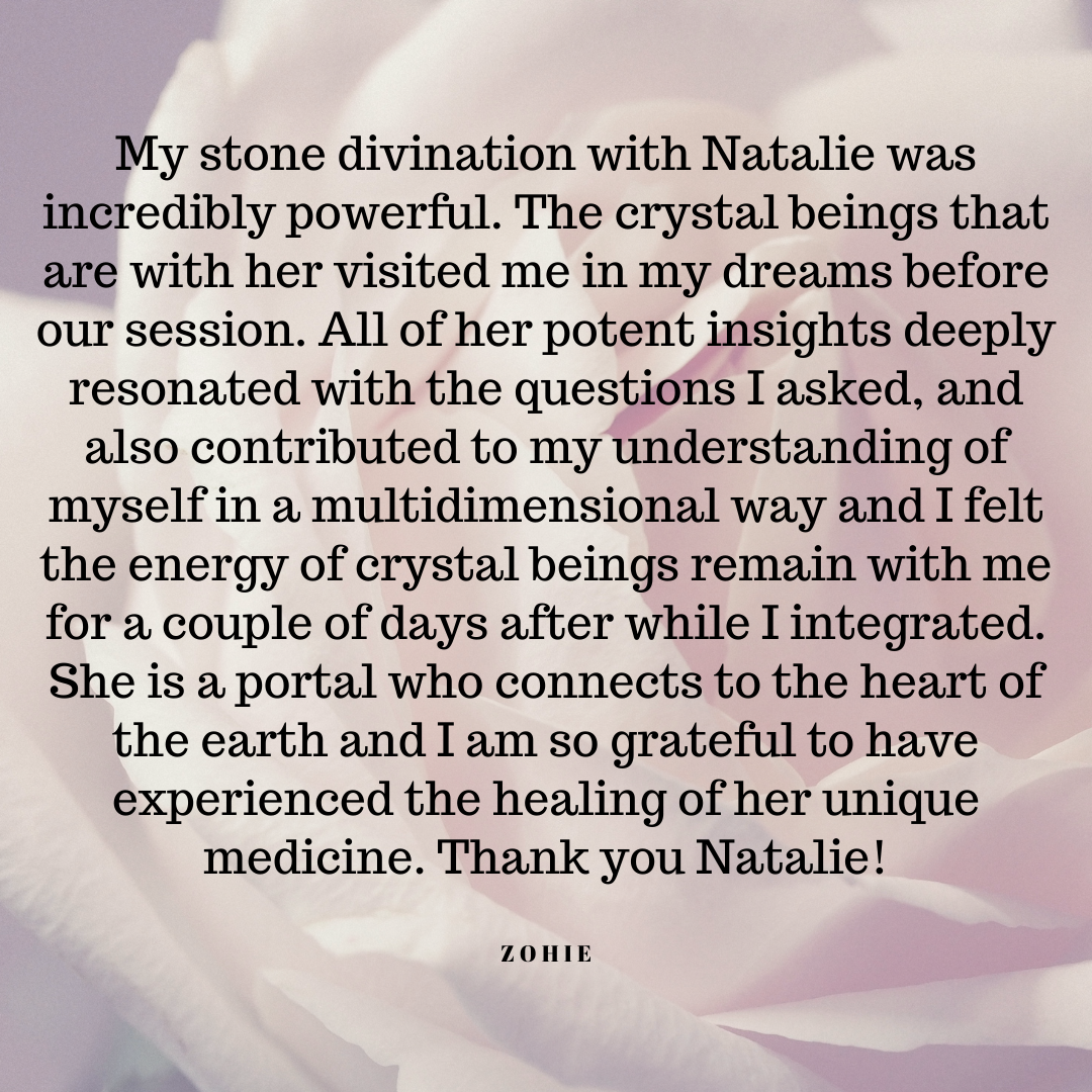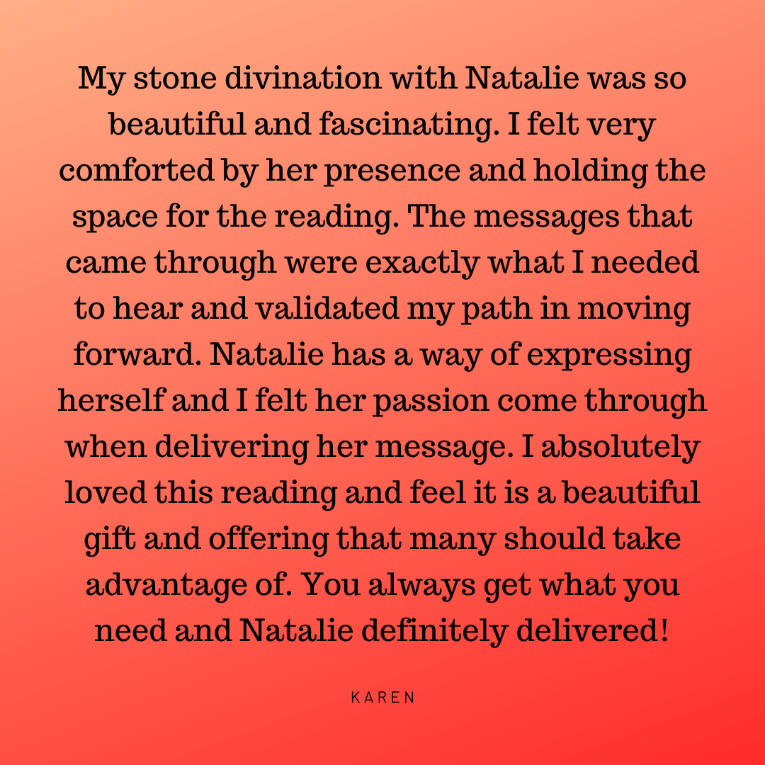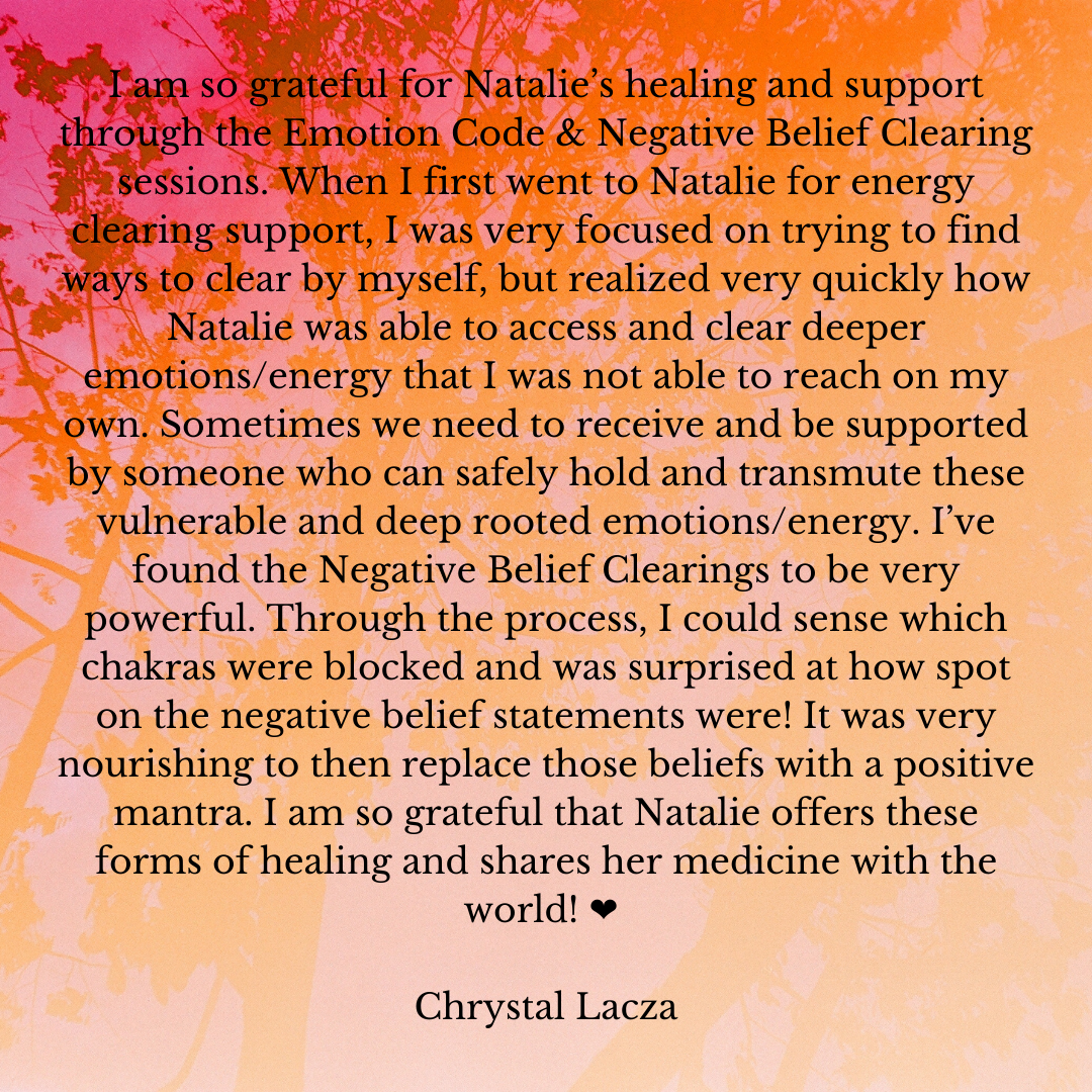 Client Testimonials Transformational 1-on-1 Sessions: The Emotion Code®: The Emotion Code® & Negative Beliefs Clearings: Group Programs: Ancestral Support Ritual: Stone Divinations: