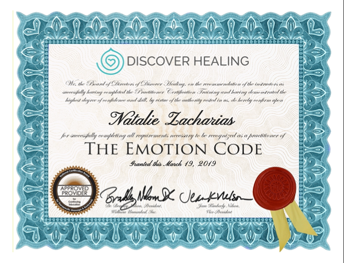 Disclaimer: The services offered by Natalie Zacharias are not counseling, mental health care or medical care and is not intended to the take the place of such care. Releasing Trapped Emotions using The Emotion Code® or any other type of Energy Healing practiced by Natalie, whether in person or by proxy, is not a substitute of medical care. This information is not intended as medical advice and should not be used for medical diagnosis or treatment. Energy Healing promotes harmony and balance of the energy system of the body, relieving stress and supporting the body’s natural ability to heal. Energy healing is widely recognized as a valuable and effective complement to conventional medical care.